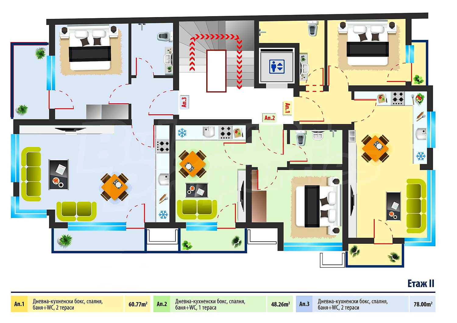 Квартира площадью 78 м2. Предлагаемая недвижимость построена в 2019. Отопление кондиционером. Обеспечено кондиционирование следующего типа: стандартные кондиционеры. Внешняя изоляция и окна пвх имеются в предлагаемой недвижимости. Из основных коммуникаций обеспечены электричество, центральное водоснабжение и центральная канализация. Балконы, ванная комната с туалетом, гараж, парковка вне дороги, заасфальтированная дорога, интернет и кабельное телевидение имеются в наличии среди прочих указанных характеристик предлагаемого объекта, что обеспечит дополнительный комфорт для пользования. Виды на населенный пункт открываются с недвижимости, раскрывая часть красот живописной Болгарии.