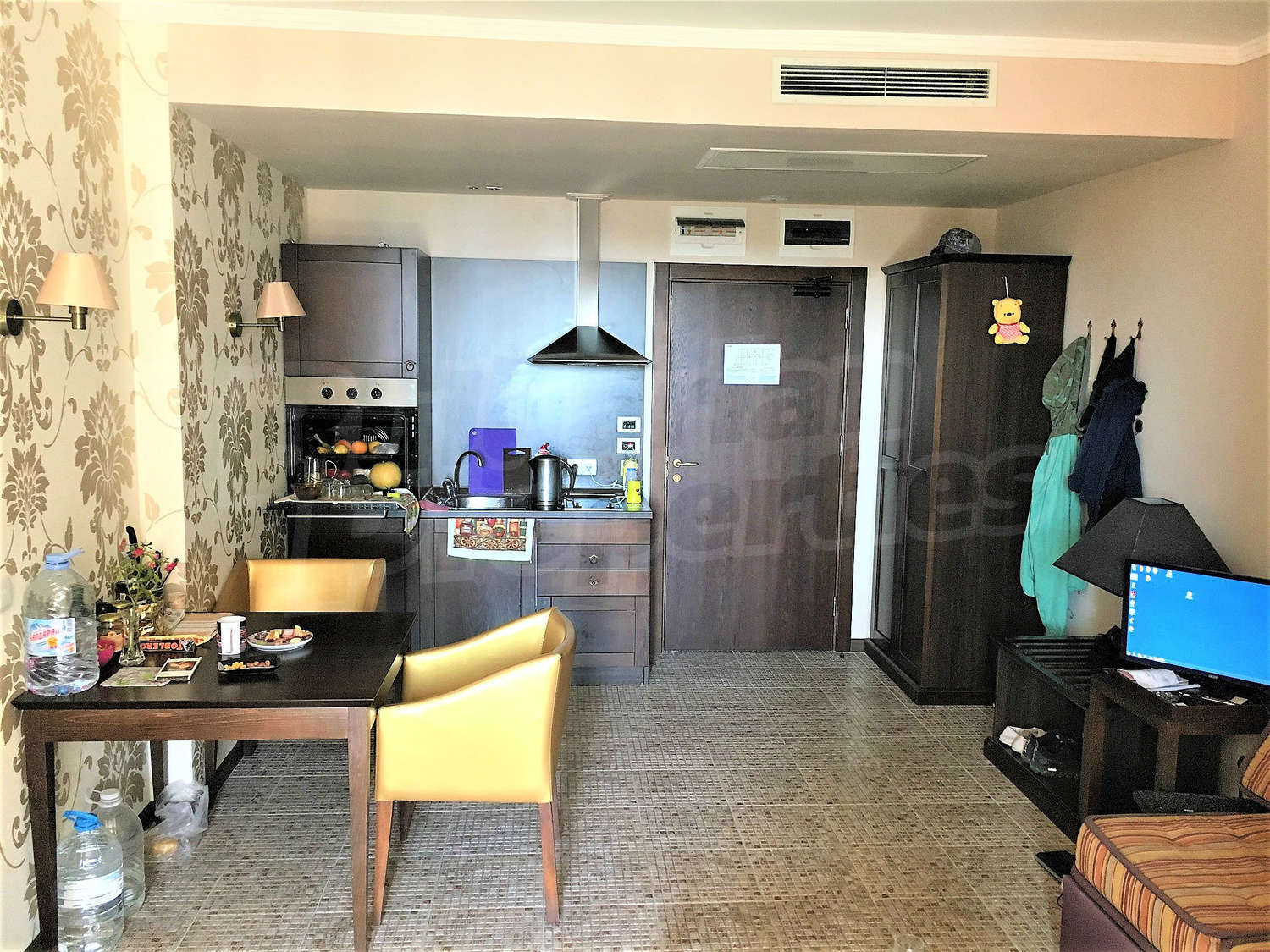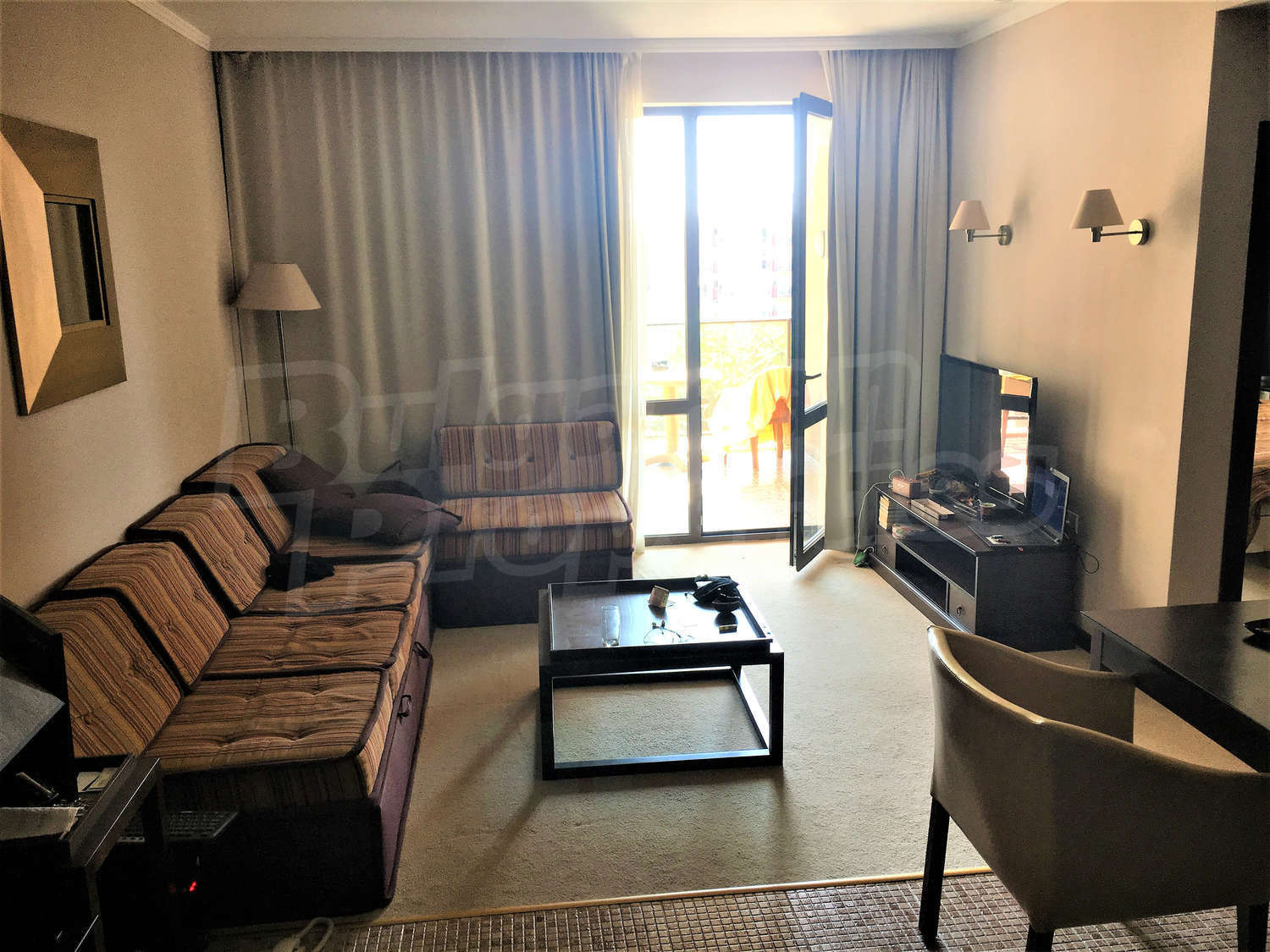 Двухкомнатная квартира площадью 70 м2. Предлагаемая недвижимость построена в 2005. Отопление кондиционером. Обеспечено кондиционирование следующего типа: центральная система кондиционеров. Внешняя изоляция, внутренняя изоляция, двойной стеклопакет, ковровый настил, межкомнатные двери, окна пвх и терракотовый пол имеются в предлагаемой недвижимости. Недвижимость включает следующую мебель и оборудование: ванна, встроенная кухня, вытяжка, духовка, кондиционер, мебель, оборудованная ванная комната, стиральная машина, телевизор и холодильник. Из основных коммуникаций обеспечены электричество, центральное водоснабжение и центральная канализация. Балконы, ванная комната с туалетом, гараж, стоянка, бассейн, джакузи, комплекс закрытого типа, консьерж, лифт, общие части с отделкой люкс, сауна, тренажерный зал, заасфальтированная дорога, интернет, интернет Wi-Fi, кабельное телевидение, система охранной сигнализации и телефон имеются в наличии среди прочих упомянутых характеристик предлагаемого объекта, что обеспечит дополнительные удобства для пользования. Виды на бассейн, виды на внутренний двор и виды на море открываются с недвижимости, раскрывая часть красот живописной Болгарии.