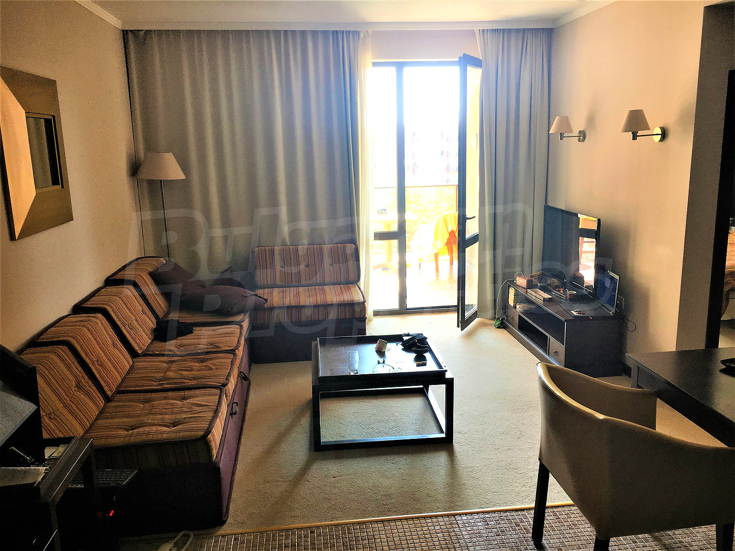 Двухкомнатная квартира площадью 70 м2. Предлагаемая недвижимость построена в 2005. Отопление кондиционером. Обеспечено кондиционирование следующего типа: центральная система кондиционеров. Внешняя изоляция, внутренняя изоляция, двойной стеклопакет, ковровый настил, межкомнатные двери, окна пвх и терракотовый пол имеются в предлагаемой недвижимости. Недвижимость включает следующую мебель и оборудование: ванна, встроенная кухня, вытяжка, духовка, кондиционер, мебель, оборудованная ванная комната, стиральная машина, телевизор и холодильник. Из основных коммуникаций обеспечены электричество, центральное водоснабжение и центральная канализация. Балконы, ванная комната с туалетом, гараж, стоянка, бассейн, джакузи, комплекс закрытого типа, консьерж, лифт, общие части с отделкой люкс, сауна, тренажерный зал, заасфальтированная дорога, интернет, интернет Wi-Fi, кабельное телевидение, система охранной сигнализации и телефон имеются в наличии среди прочих упомянутых характеристик предлагаемого объекта, что обеспечит дополнительные удобства для пользования. Виды на бассейн, виды на внутренний двор и виды на море открываются с недвижимости, раскрывая часть красот живописной Болгарии.