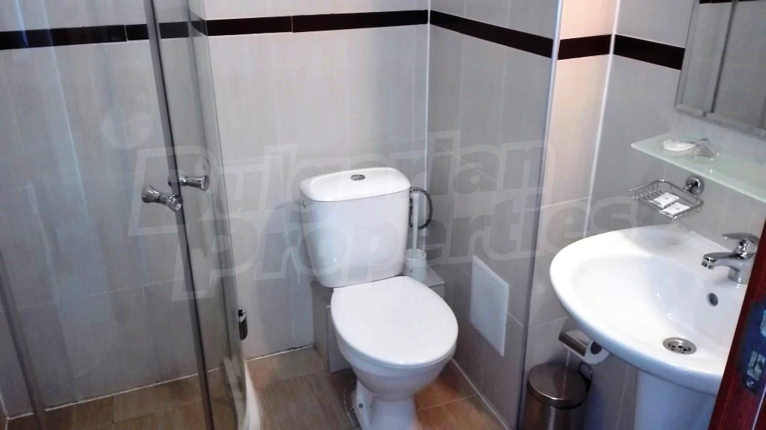 Недвижимость предлагается к продаже полностью меблированной. Кухня с кухонными шкафами, вытяжка, холодильник, раковина, плита, две односпальные кровати с тумбочками, шкаф для одежды, телевизор. Ванная комната оборудована душевой кабиной, раковиной с зеркалом и туалетом.