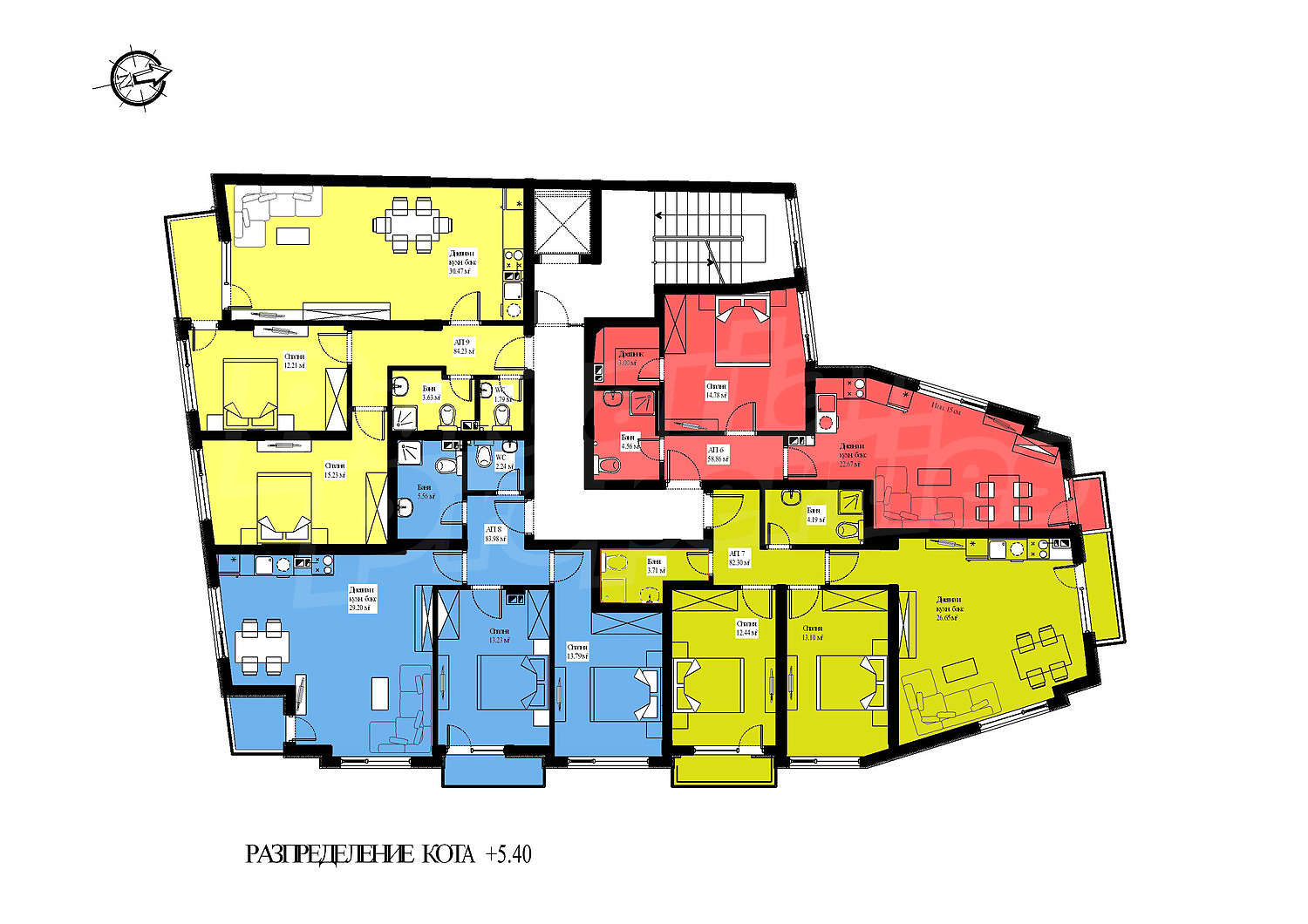 79.81 м2 (жилая площадь: 67.45 м2 плюс общие части: 12.36 м2) еще