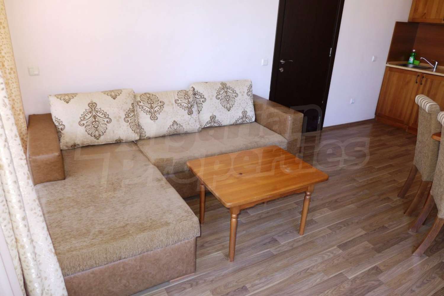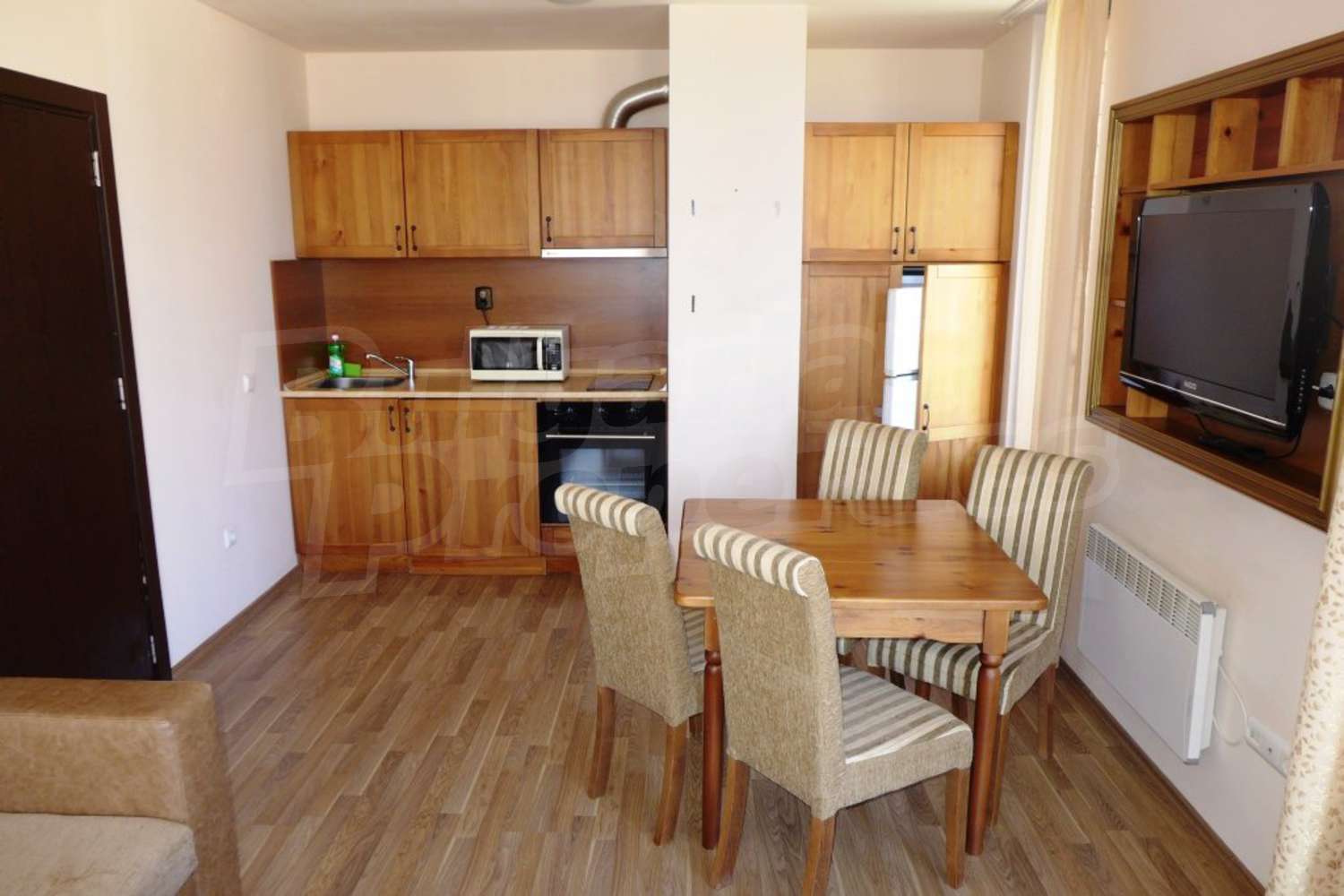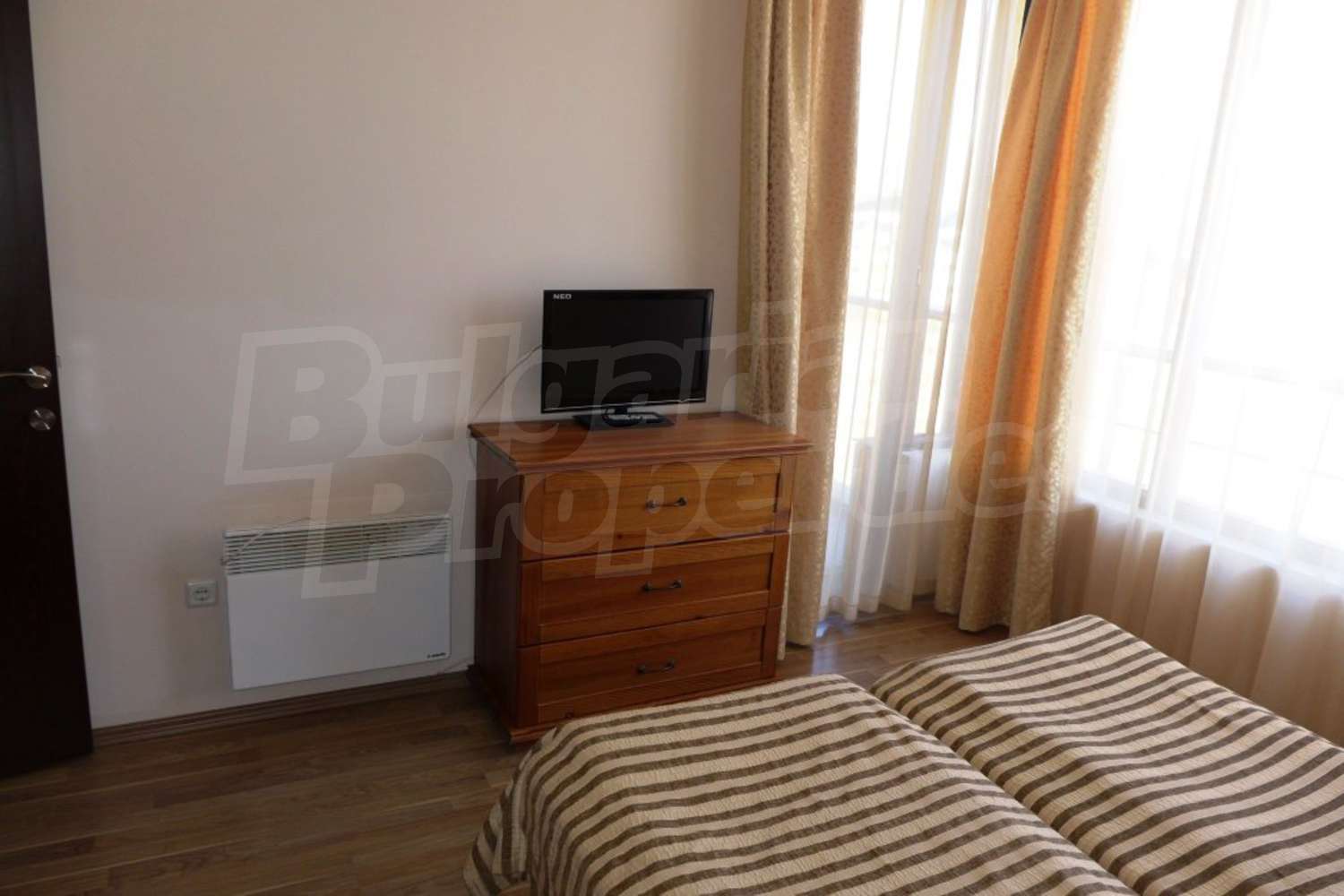 Двухкомнатная квартира площадью 58.36 м2. Предлагаемая недвижимость построена в 2013. Отопление на электрических радиаторах, отопление на электричестве и отопление на электроконвекторах. Внешняя изоляция, ламинированный пол, межкомнатные двери, окна пвх, стены покрашенные латексной краской и терракотовый пол имеются в предлагаемой недвижимости. Недвижимость включает следующую меблировку и оборудование: бойлер электрический, встроенная кухня, вытяжка, душевая, меблировку, оборудованная ванная комната, телевизор и холодильник. Из основных коммуникаций обеспечены электричество, центральное водоснабжение и центральная канализация. Балконы, ванная комната с туалетом, парковка вне дороги, стоянка, терраса, бассейн, комплекс закрытого типа, консьерж, лифт, общие части с отделкой люкс, сауна, заасфальтированная дорога, интернет, интернет Wi-Fi и кабельное телевидение имеются в наличии среди прочих отличительных характеристик предлагаемого объекта, что обеспечит дополнительные удобства для пользования. Виды на гольф поле, виды на горы и виды на лес открываются с недвижимости, раскрывая часть красот живописной Болгарии.