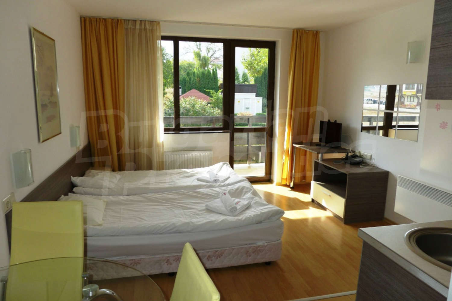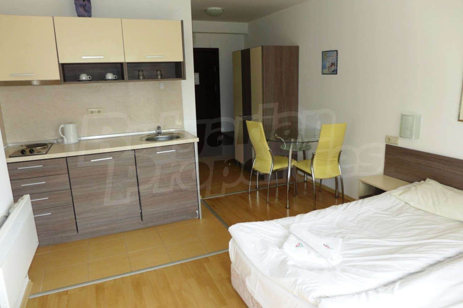 Квартира-студия площадью 39.16 м2. Предлагаемая недвижимость построена в 2008. Отопление на электрических радиаторах. Ламинированный пол, окна пвх, покрашенные стены и терракотовый пол имеются в предлагаемой недвижимости. Недвижимость включает следующую меблировку и оснащение: бойлер электрический, вытяжка, духовка, душевая, меблировку и оборудованная ванная комната. Из основных коммуникаций обеспечены электричество, вода и канализация. Ванная комната с туалетом, терраса, бассейн, джакузи, комплекс закрытого типа, лифт, общие части с отделкой люкс, сауна, тренажерный зал, интернет, кабельное телевидение и телефон имеются в наличии среди прочих перечисленных характеристик предлагаемого объекта, что обеспечит дополнительные удобства для пользования. Виды на внутренний двор и виды на горы открываются с недвижимости, раскрывая часть красот живописной Болгарии.