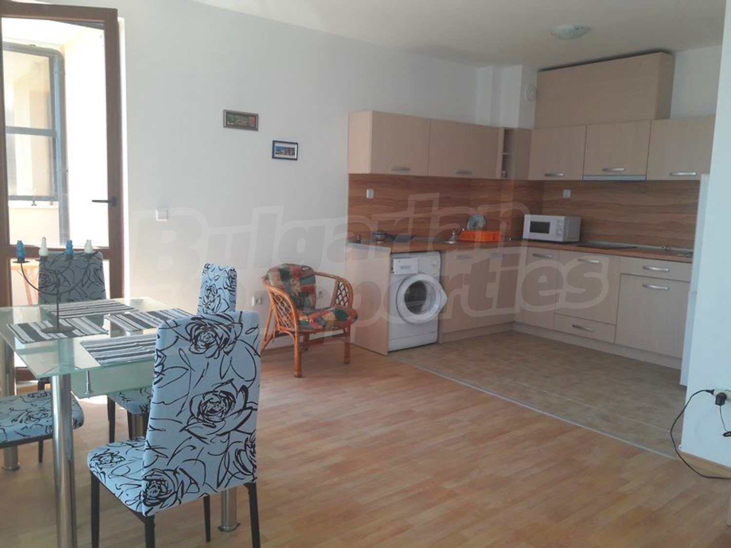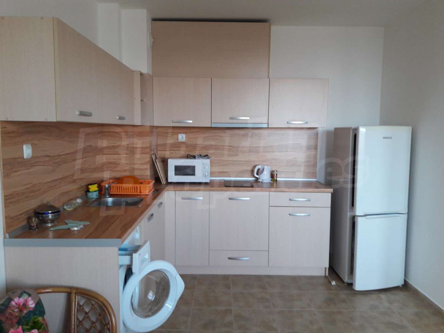 Недвижимость продается полностью меблированная. Кухня с кухонными шкафами, керамическая плита, вытяжка, стиральная машина, холодильник, обеденный стол со стульями, мягкая мебель. Спальня с большой кроватью и гардеробом. Полностью оборудованная ванная комната.