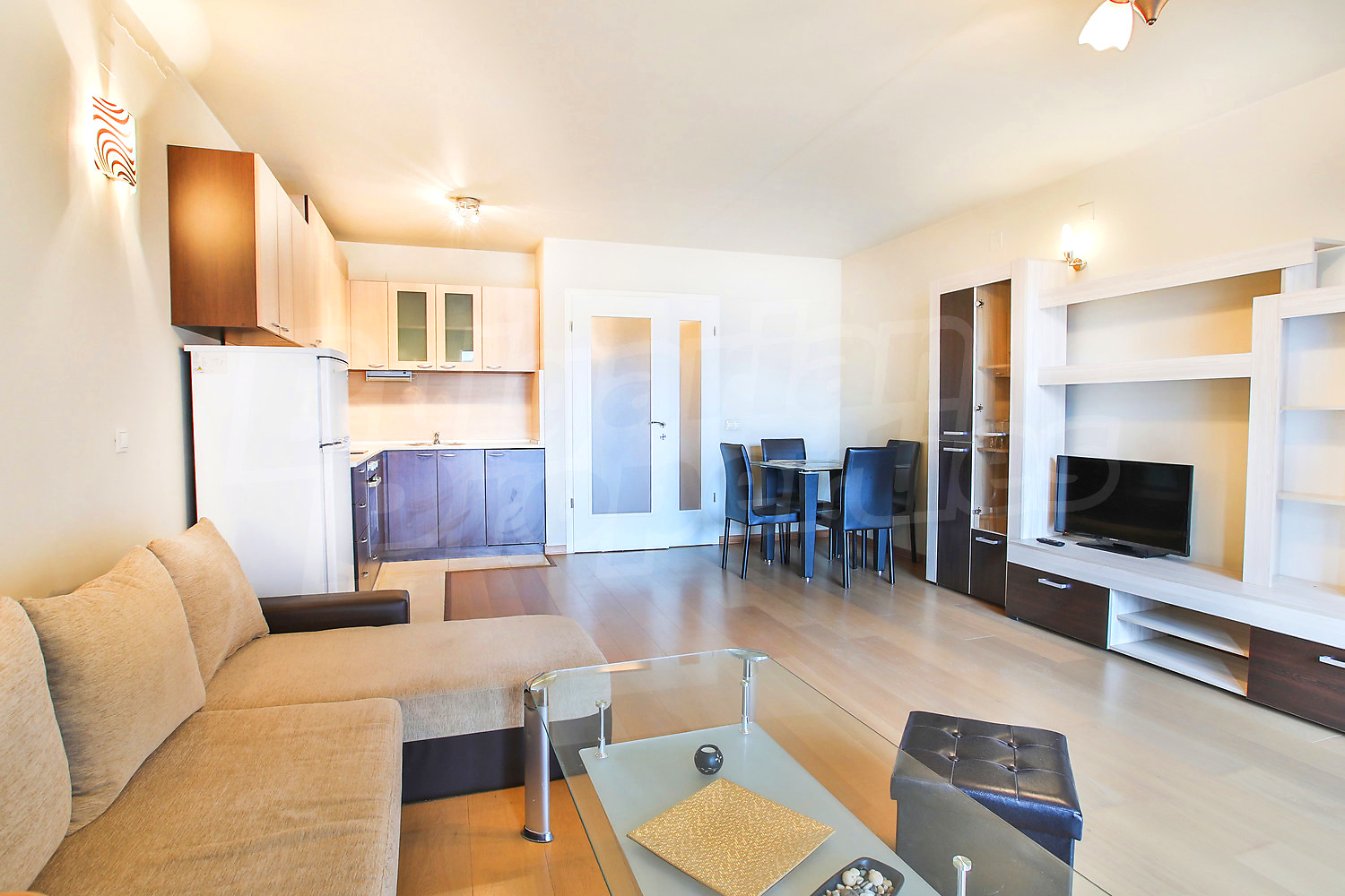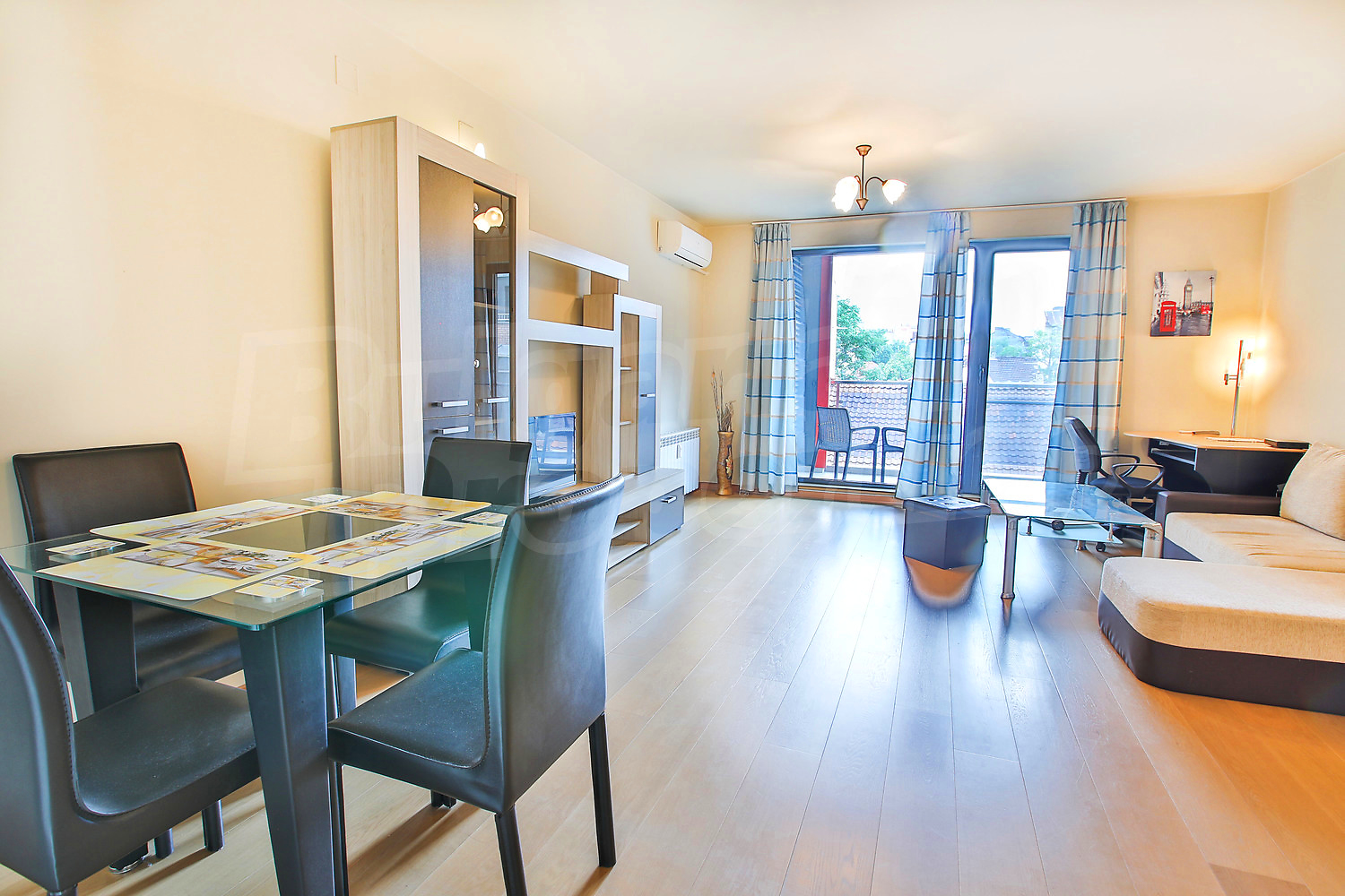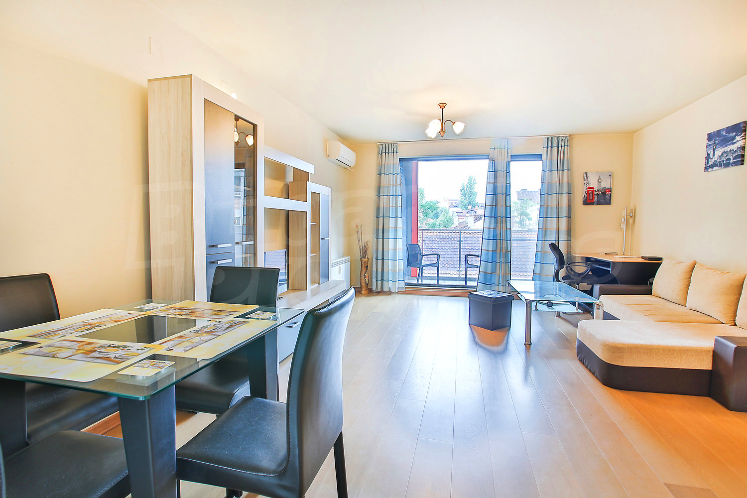 Двухкомнатная квартира площадью 100 м2. Предлагаемая недвижимость построена в 2011. Отопление кондиционером и центральное отопление. Ламинированный пол, межкомнатные двери, окна пвх, стены покрашенные латексной краской и терракотовый пол имеются в предлагаемой недвижимости. Недвижимость включает следующую мебель и оборудование: ванна, вытяжка, духовка, кондиционер, мебель, оборудованная ванная комната, стиральная машина, телевизор и холодильник. Из основных коммуникаций обеспечены электричество и центральное водоснабжение. Балконы, ванная комната с туалетом, лифт, общие части с отделкой люкс, заасфальтированная дорога, интернет, интернет Wi-Fi и кабельное телевидение имеются в наличии среди прочих обозначенных характеристик предлагаемого объекта, что обеспечит дополнительный комфорт для пользования. Виды на город открываются с недвижимости, раскрывая часть красот живописной Болгарии.