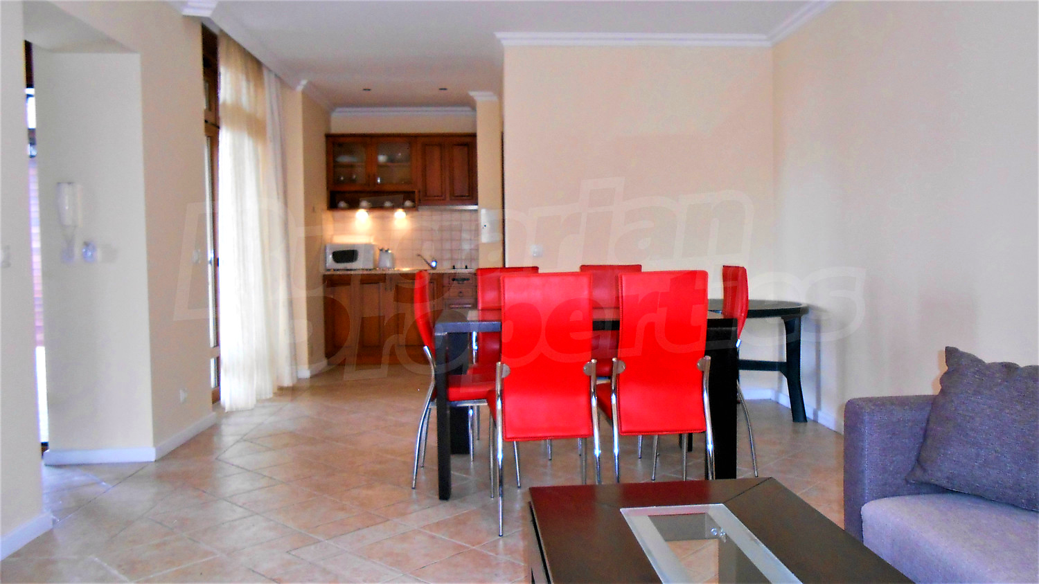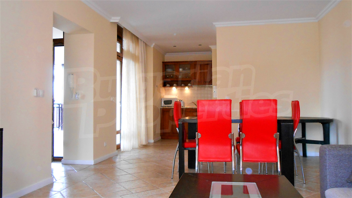 Двухкомнатная квартира площадью 96.48 кв.м. Предлагаемая недвижимость построена в 2007. Отопление кондиционером. Обеспечено кондиционирование следующего типа: стандартные кондиционеры. Алюминиевые окна, межкомнатные двери, стены покрашенные латексной краской и терракотовый пол имеются в предлагаемой недвижимости. Недвижимость включает следующую мебель и оборудование: вытяжка, мебель и оборудованная ванная комната. Из основных коммуникаций обеспечены электричество и центральное водоснабжение. Ванная комната с туалетом, терраса, интернет и кабельное телевидение имеются в наличии среди прочих характеристик предлагаемого объекта, что обеспечит дополнительный комфорт для пользования. Виды на внутренний двор открываются с недвижимости, раскрывая часть красот живописной Болгарии.