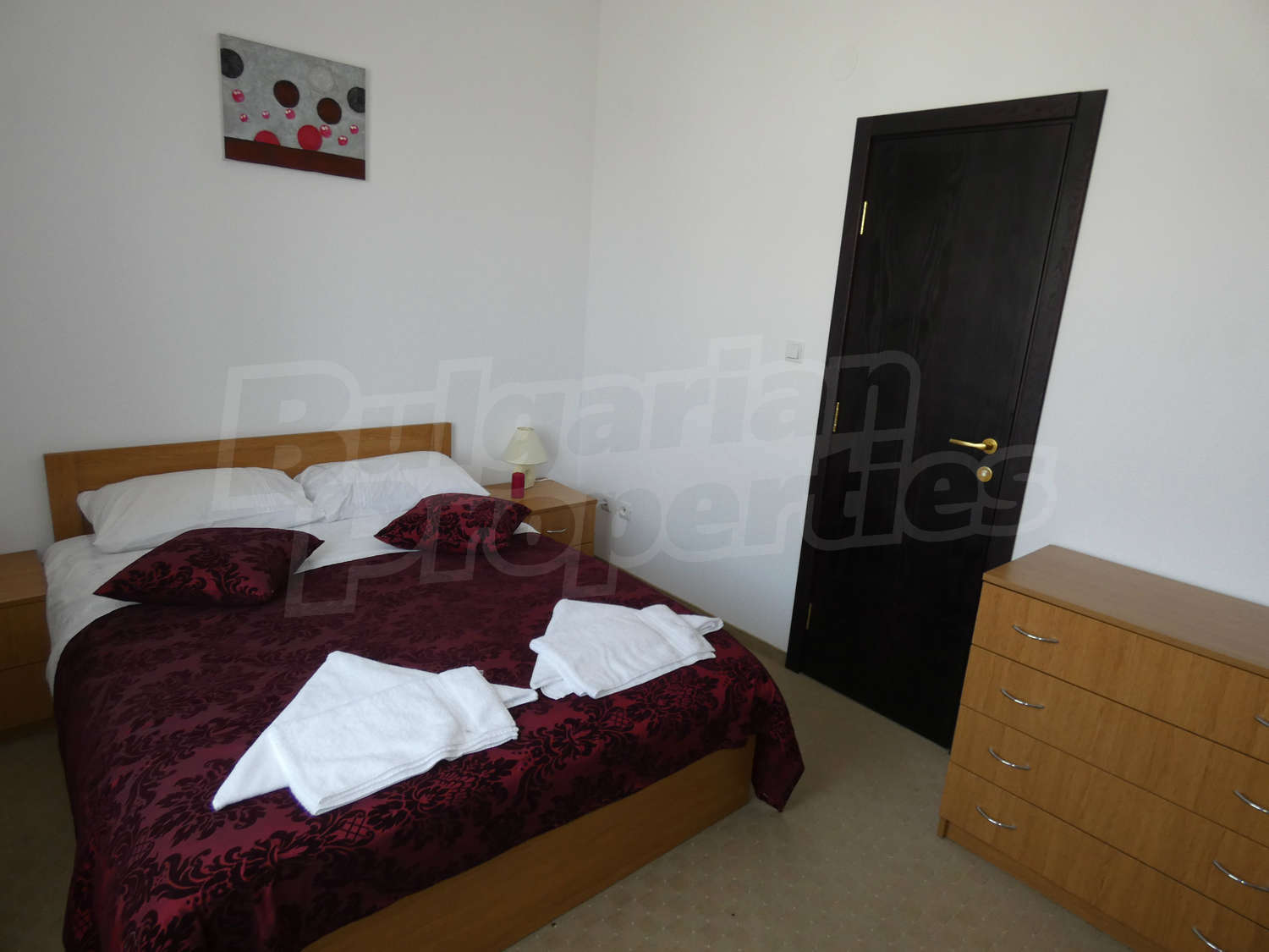 • Спальня 1: двуспальная кровать, 2 прикроватные тумбочки с ночниками, шкаф с зеркалом, комод