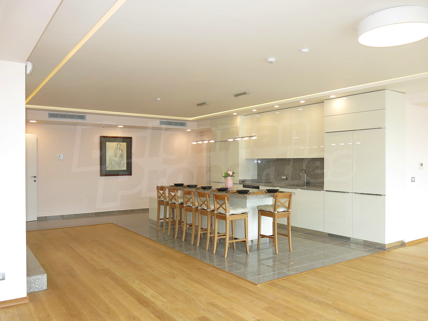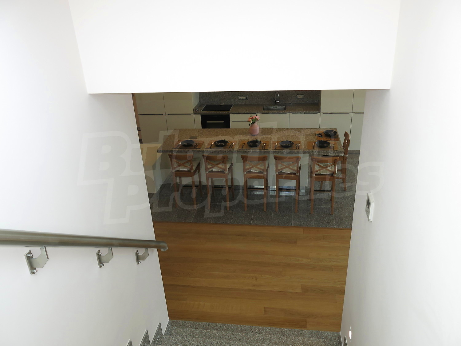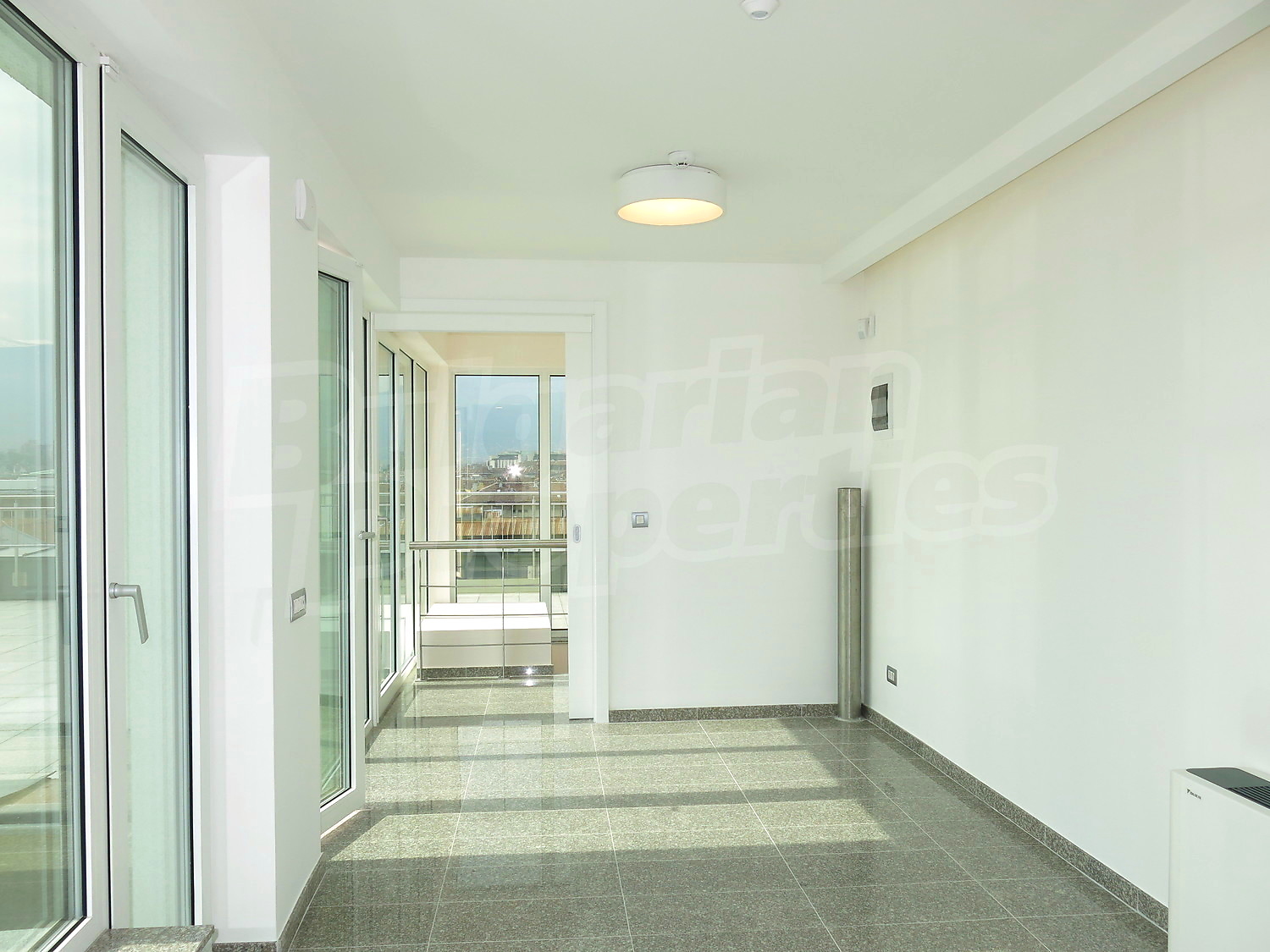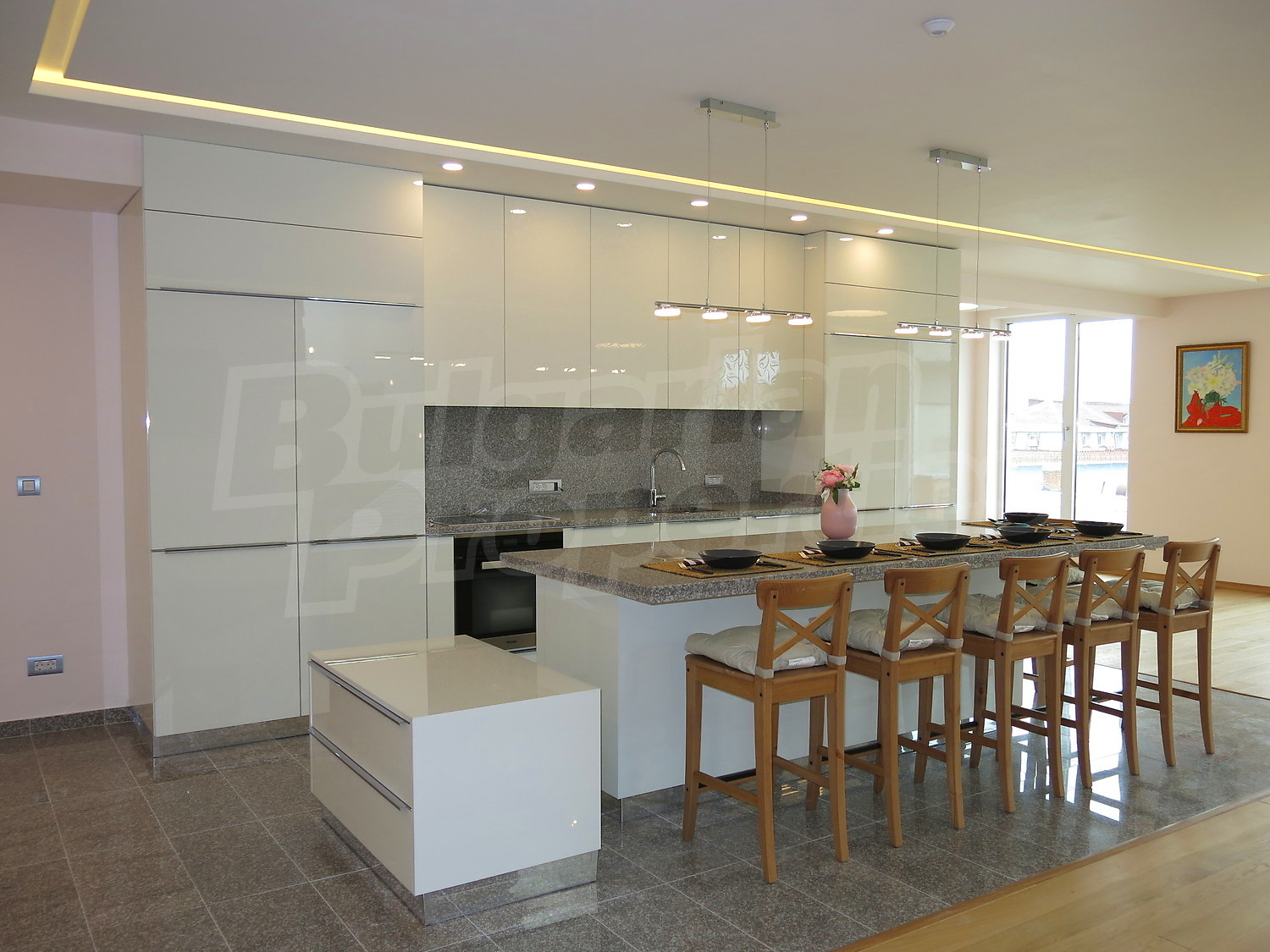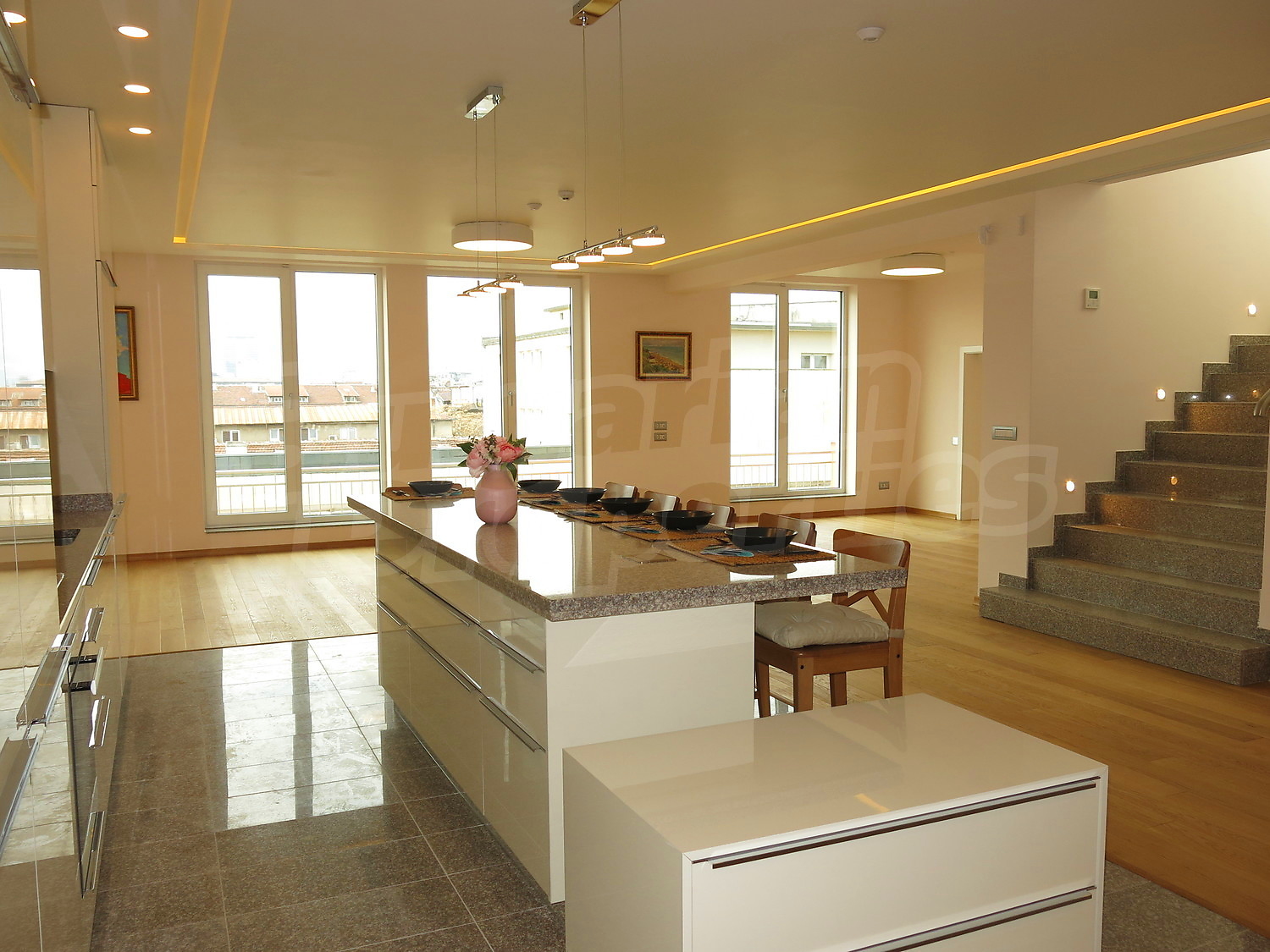 Пентхаус в двух уровнях площадью 585 м2. Предлагаемая недвижимость построена в 2014. Отопление кондиционером. Обеспечено кондиционирование следующего типа: центральная система кондиционеров. Армированная входная дверь, ламинированный пол, межкомнатные двери, окна пвх и покрашенные стены имеются в предлагаемой недвижимости. Недвижимость включает следующую меблировку и оснащение: вытяжка, духовка и холодильник. Из основных коммуникаций обеспечены электричество, центральное водоснабжение и центральная канализация. Балконы, ванная комната с туалетом, консьерж, лифт, общие части с отделкой люкс, интернет, кабельное телевидение и телефон имеются в наличии среди прочих указанных характеристик предлагаемого объекта, что обеспечит дополнительный комфорт для пользования. Виды на внутренний двор и виды на населенный пункт открываются с недвижимости, раскрывая часть красот живописной Болгарии.