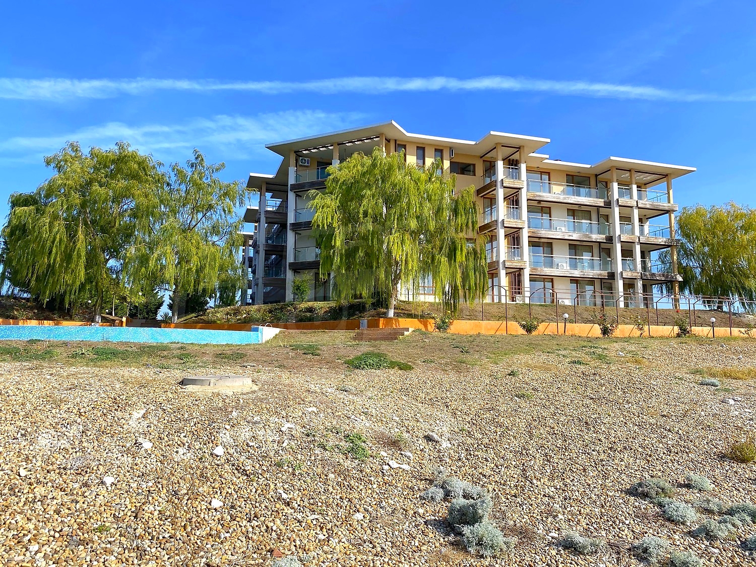 До пляжа можно дойти по лестинце, которая расположена у подножия скалы, на вершине которой находится комплекс.
