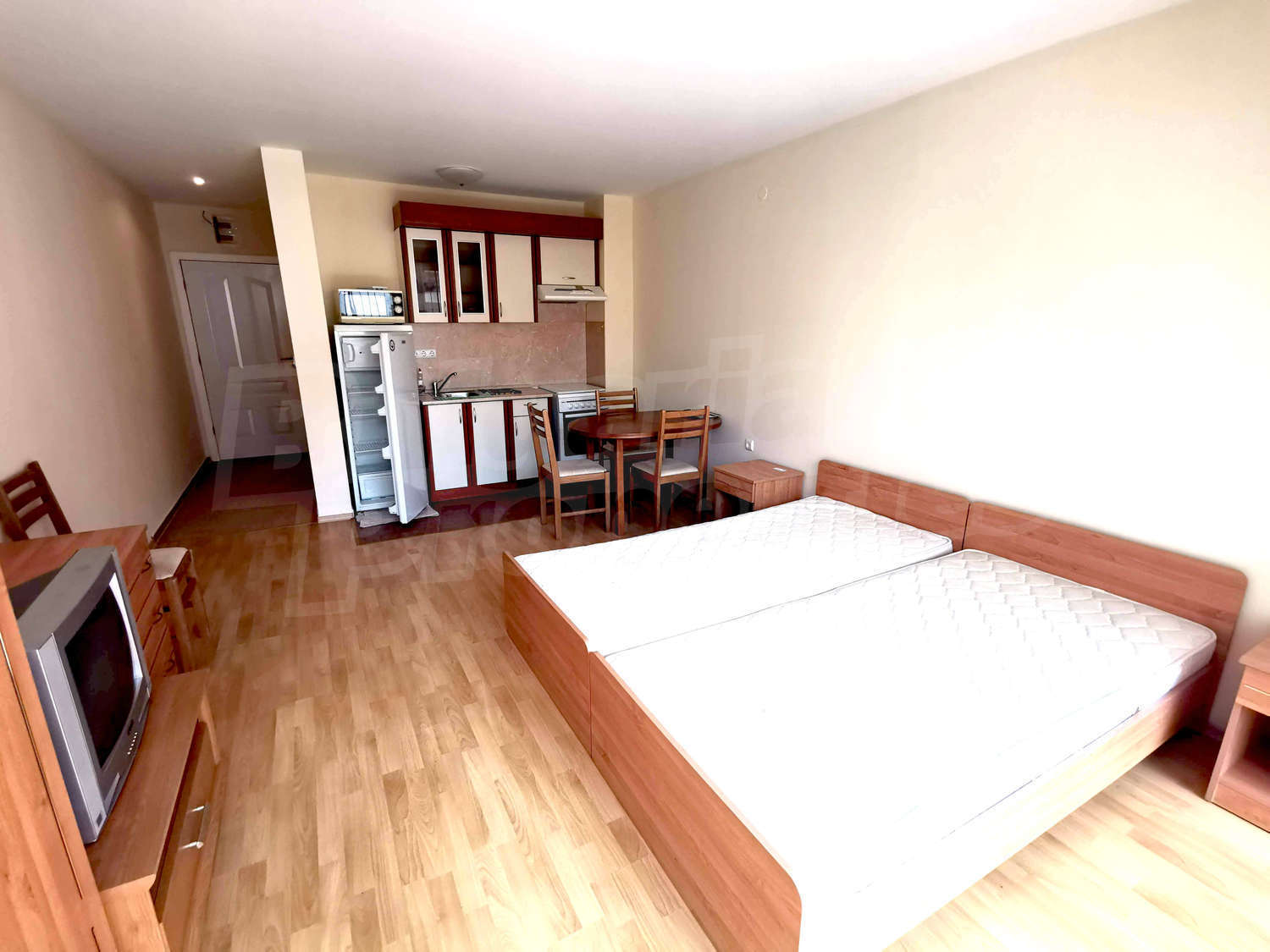 Полностью меблированная и оборудованная студия на первой линии (50 м от пляжа), в закрытом комплексе Privilege Fort Beach. Непосредственная близость к морю, аквапарку, супермаркету и автобусной остановке делает комплекс идеальным местом для отдыха в любое время года. Годовая плата за обслуживание - 12 евро за м2.