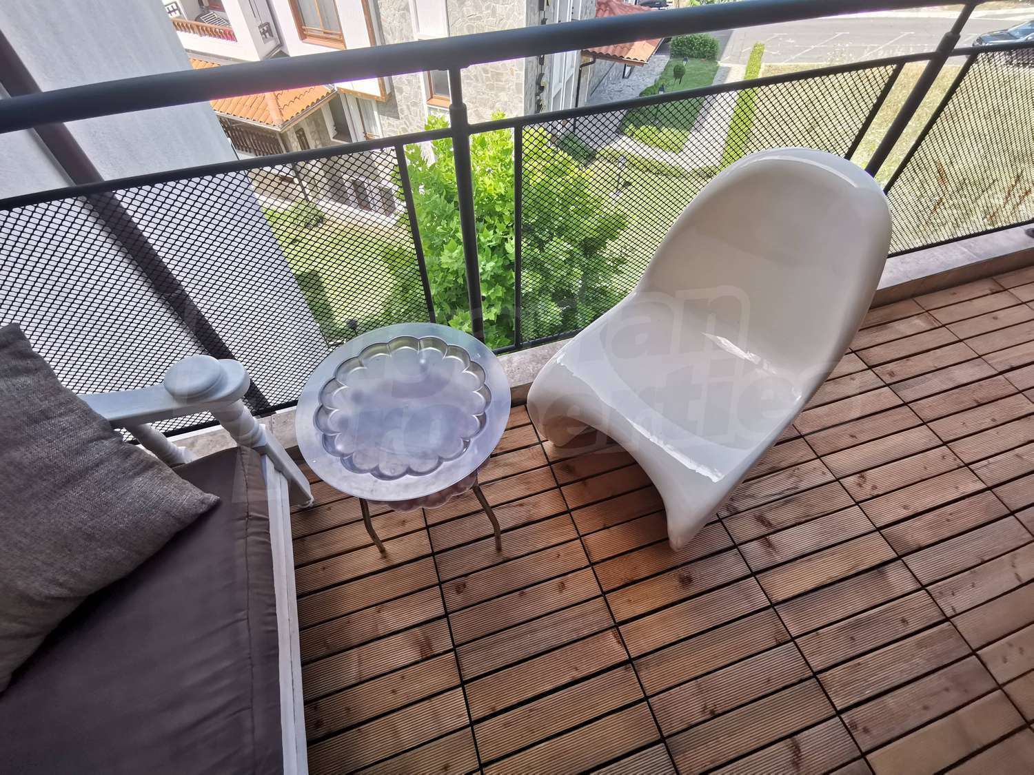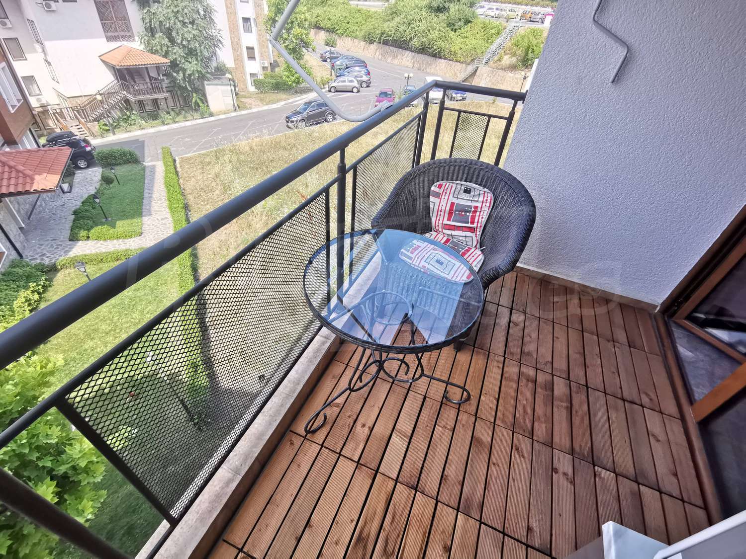 • балкон с прекрасным видом на внутренний двор комплекса и обставленный садовой мебелью - садовый столик для кованого железа на завтрак, глубоко пропитанный садовый декор