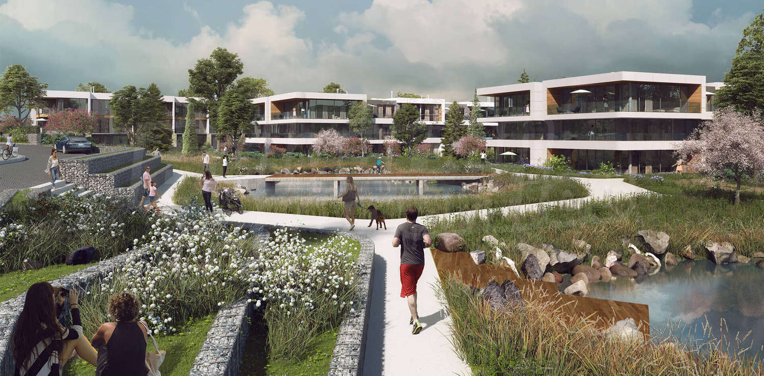 Комплекс будет отличаться богатым ландшафтным дизайном, прудами и водными эффектами, практичными и безопасными улицами и аллеями, зонами отдыха и игровыми площадками. Внимание к каждой детали окружающей среды и оптимальное использование имеющейся коммерческой, спортивной, социальной и образовательной инфраструктуры. Транспортные средства ограничены периферией комплекса. Заросшая река была использована для создания нового озера, чтобы сохранить привлекательность и простор для прогулок и отдыха.
