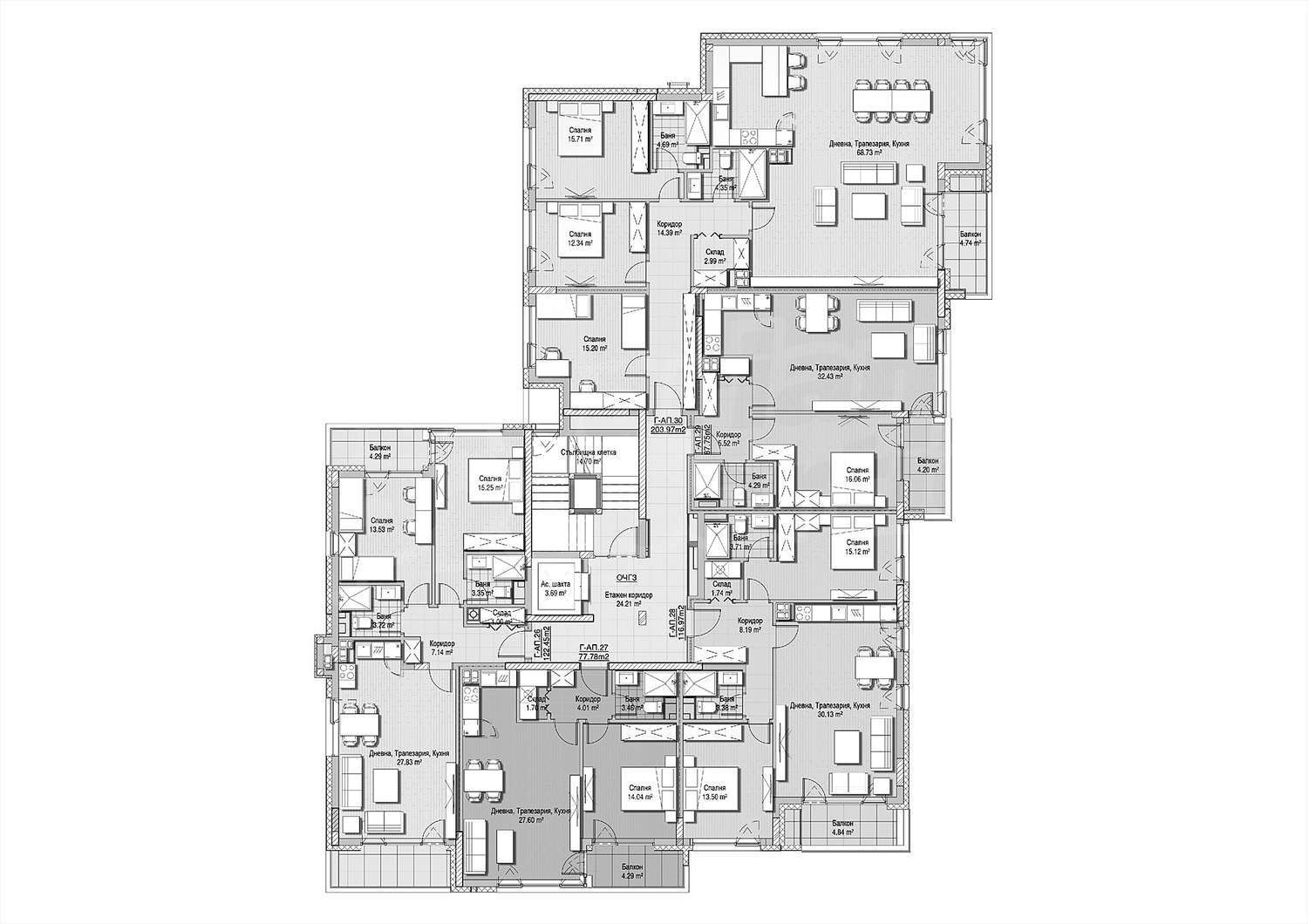 Квартиры - 159 квартир, распределенных по пяти подъездам. Квартиры отличаются функциональными и светлыми пространствами с индивидуальным характером для полноценной жизни в оживленном городе.