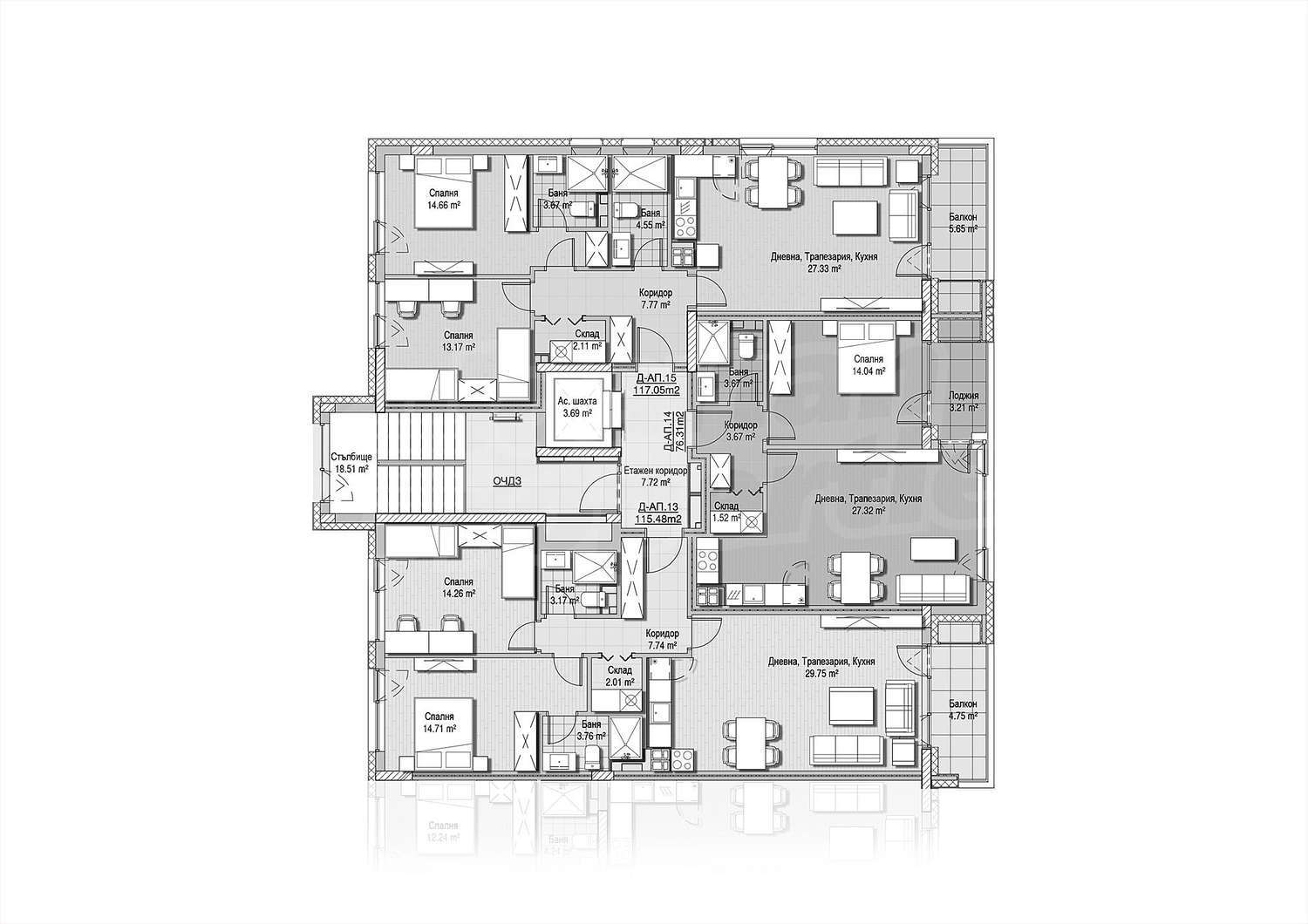 Квартиры - 159 квартир, распределенных по пяти подъездам. Квартиры отличаются функциональными и светлыми пространствами с индивидуальным характером для полноценной жизни в оживленном городе.