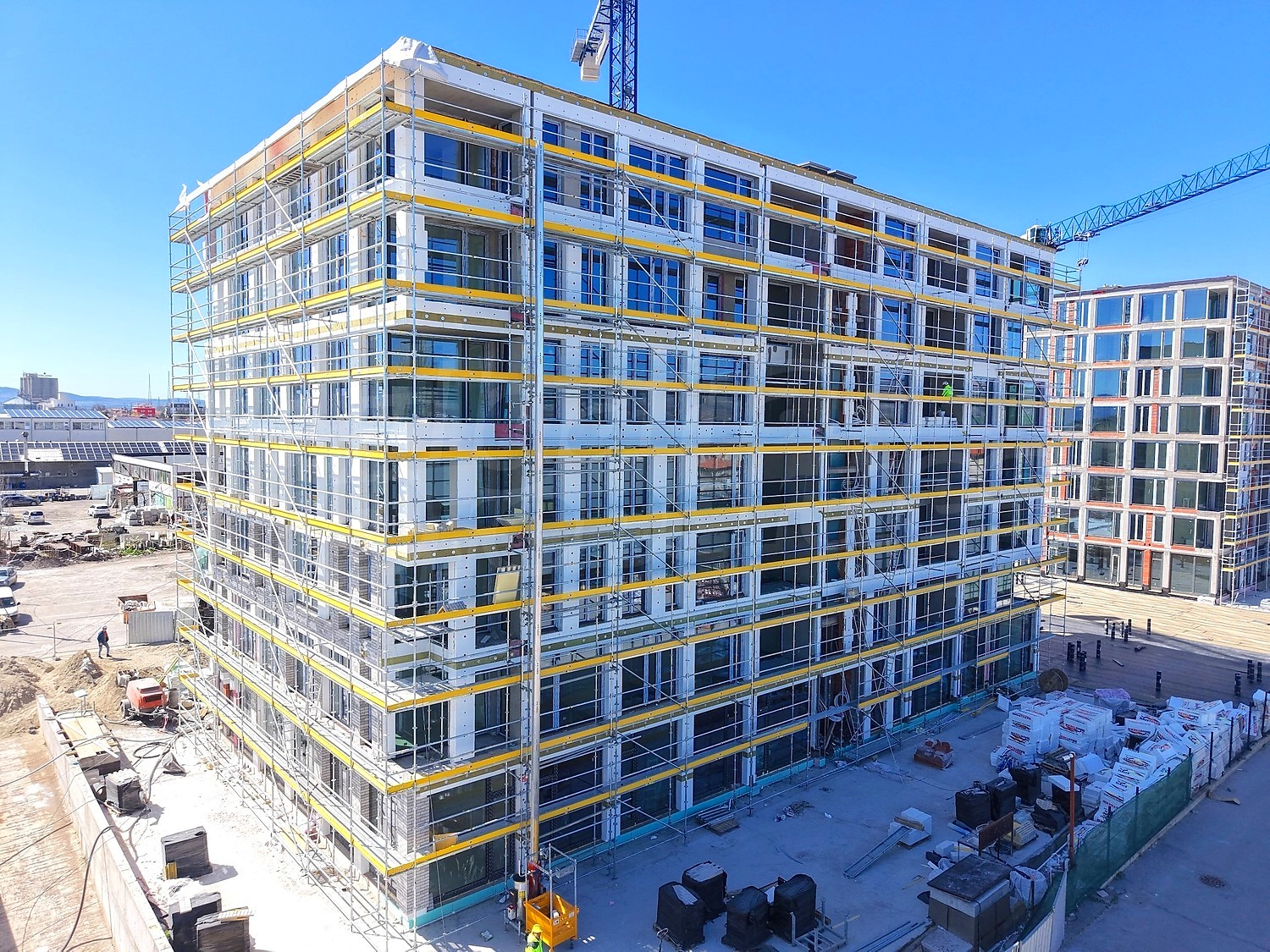 Планировка зданий ортогональна и ориентирована в наиболее благоприятных географических направлениях. Для доступа к каждому зданию спроектирована внутренняя сеть пешеходных связей. На уровне первого этажа расположены торговые площади, кафе и детский центр, каждый объект имеет собственный вход. Предусмотрена парковка: подземный уровень и наземные парковочные места. Автомобильный доступ к подземной парковке осуществляется по одной двухполосной и одной однополосной рампе из тупика, расположенного к западу от объекта.