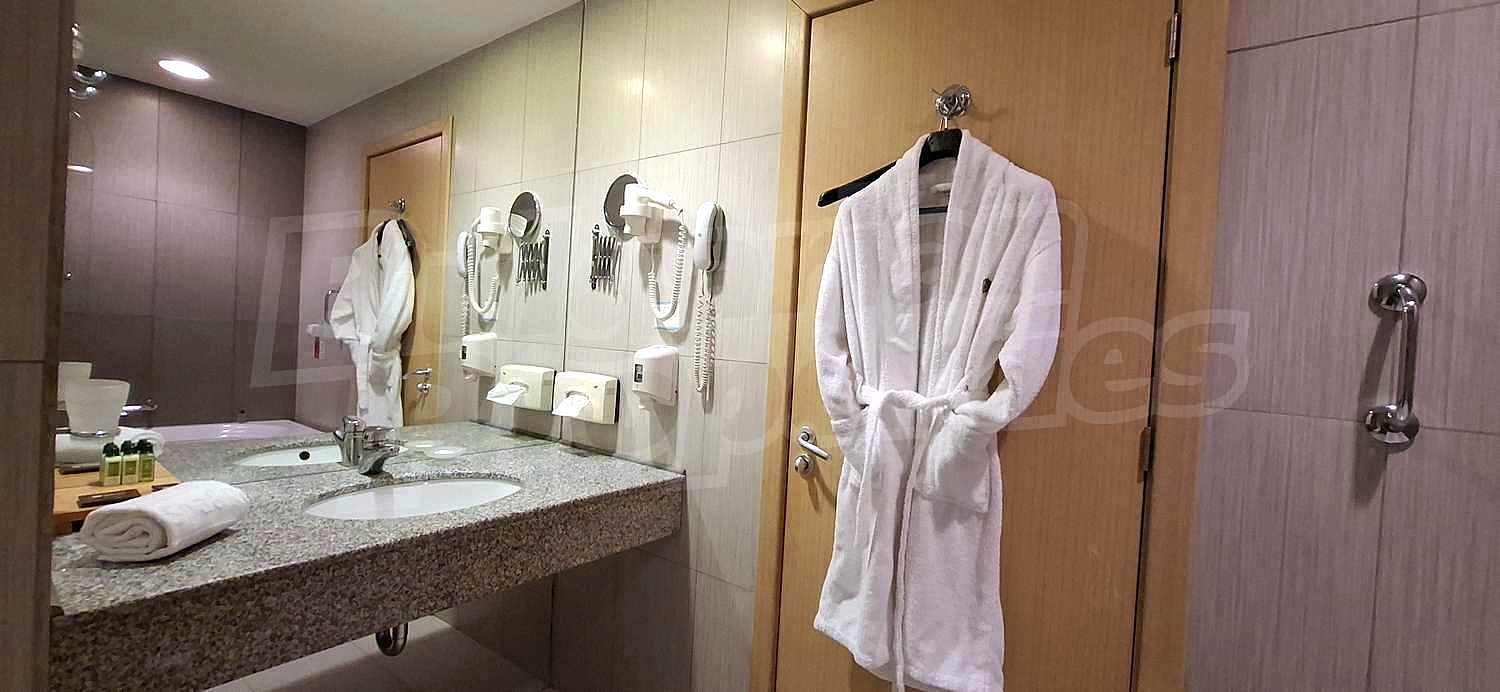 • Просторная и оборудованная ванная комната с туалетом - ванна с душем, унитаз, раковина со столешницей и зеркалом, телефон, система SOS, фен