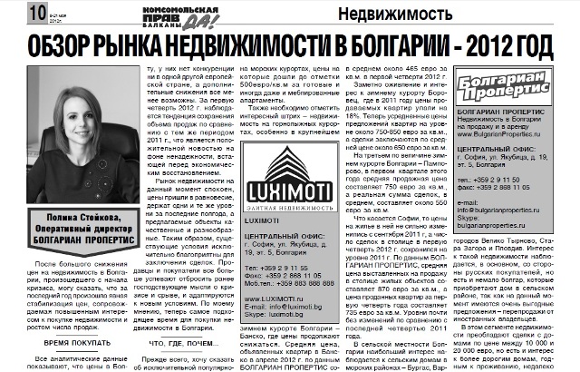 Все аналитические данные показывают, что цены в Болгарии на данный момент очень выгодные и, по большому счету, у них нет конкуренции ни в одной другой европейской стране, а дополнительные снижения все менее возможны. За первую четверть 2012 г. наблюдается тенденция сохранения объема продаж по сравнению с тем же периодом 2011 г., что является положительной новостью на фоне ненадежности, встающей перед экономическим восстановлением.