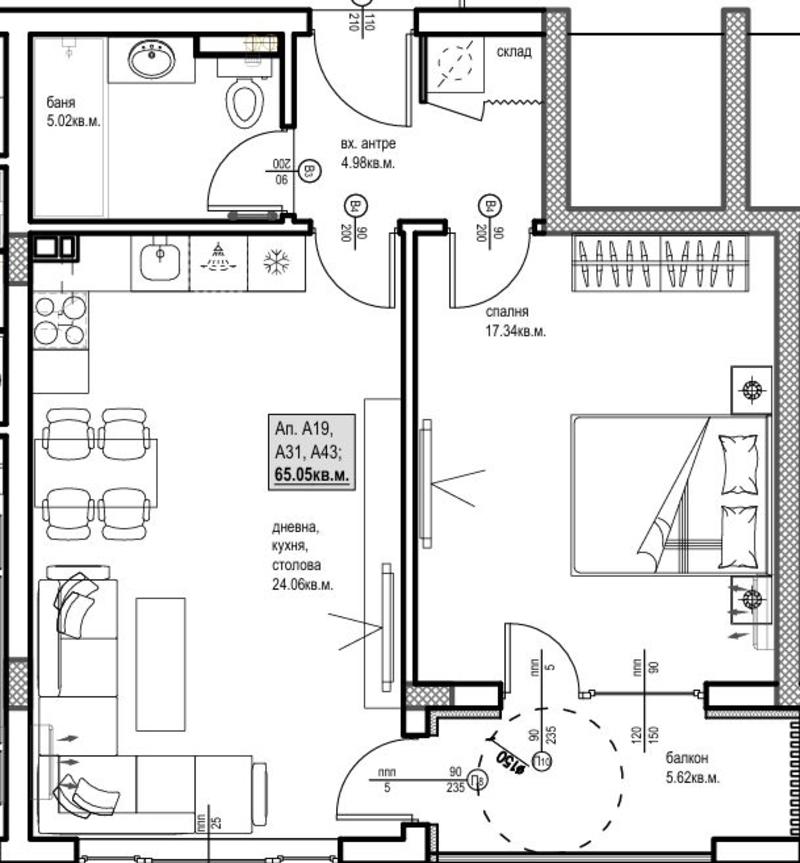 Функционально распределенная студия рядом с бульваром Болгария г. София , кв. «Манастирски Ливади» Готовая к заселению квартира с коммуникативным расположением рядом с торговым центром Болгария Вашему вниманию предлагается двухкомнатная квартира площадью 55 кв.м. рядом с. Болгария, ул. Тодора Александрова, ТРЦ "Болгария", в шаговой доступности от супермаркетов, аптек, поликлиник, ресторанов, кафе, остановок общественного транспорта, что делает доступ в любую точку