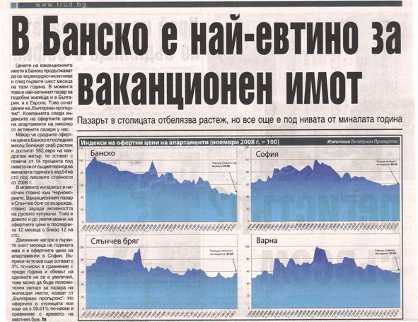 Компания следит за индексами цен предлагаемых на продажу квартир в несколких активных рынках в Болгарии. Несмотря на то, что усредненные цены в Банско за последний месяц отмечают небольшой рост и достигают 582 евро за кв.м., они остаются более, чем на 14% своих уровней того же периода прошлого года и на свыше54% ниже пиковых показателей 2008 г.