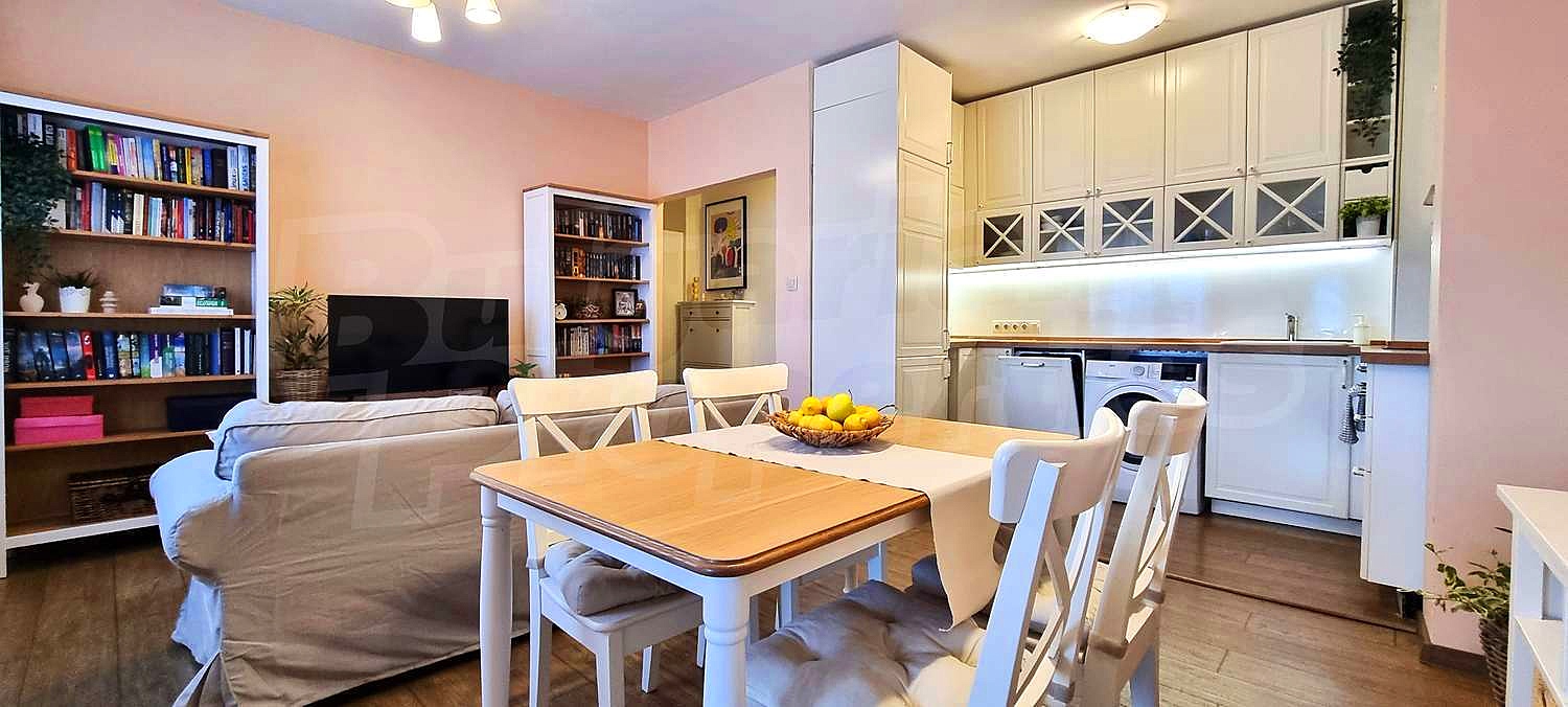 Предлагаем вашему вниманию стильную и полностью меблированную трёхкомнатную квартиру, расположенную в тихом и зелёном районе Изгрев города Банкя — одного из самых престижных бальнеологических курортов Болгарии. Жильё находится на третьем (последнем) этаже хорошо обслуживаемого здания нового строительства (2011 г.) с отличными общими частями и удобной локацией недалеко от центра города.